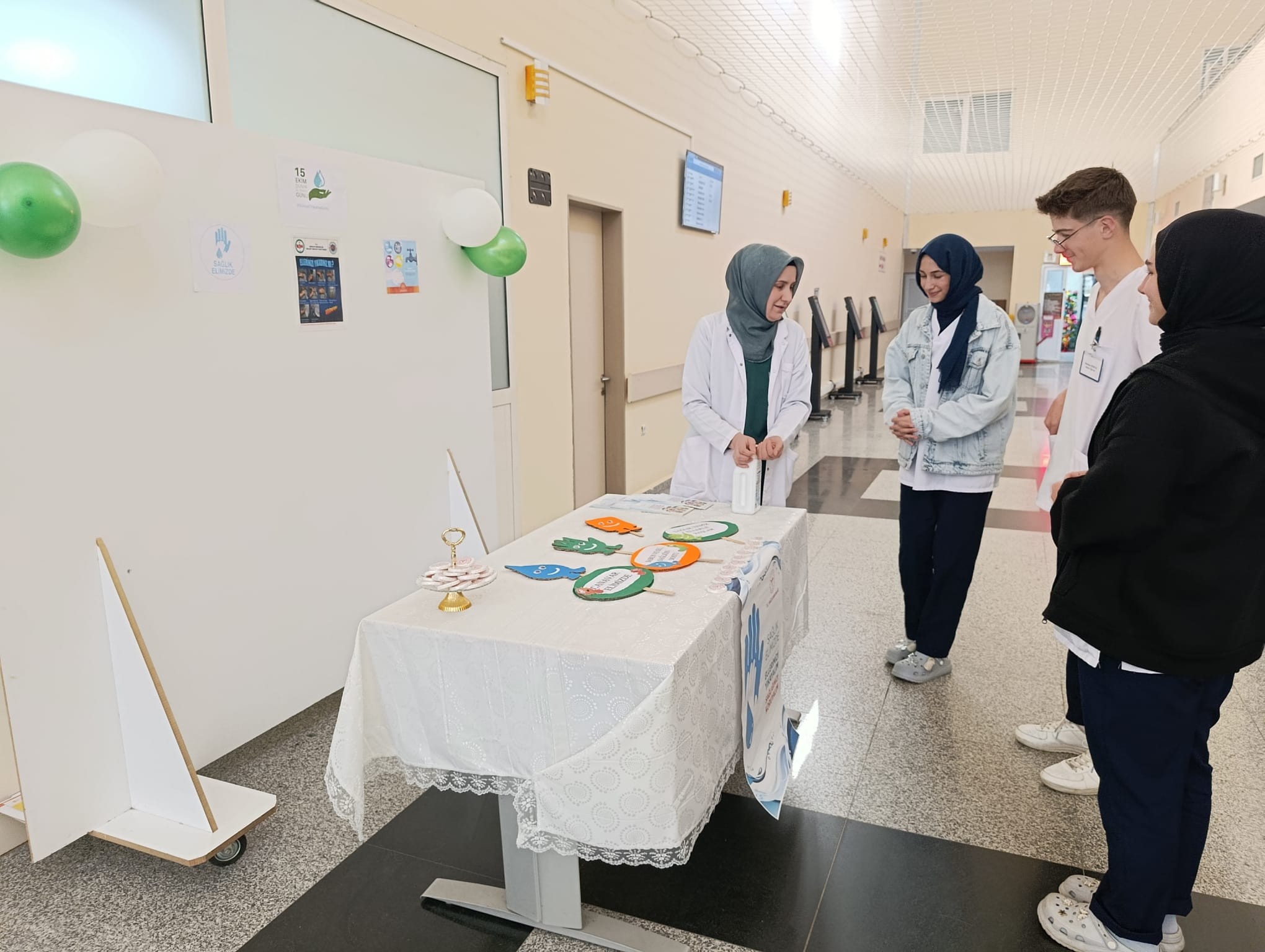 Hastane içerisinde kurulan stantta hem hasta ve yakınlarına hem de sağlık personeline el yıkamanın önemi anlatıldı, bilgilendirici broşürler dağıtıldı ve küçük hediyeler takdim edildi.